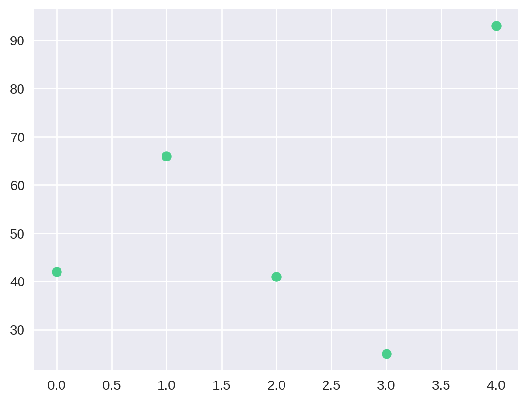 array([42, 66, 41, 25, 93])Com esses dados em mãos, vamos criar um intervalo linearmente espaçado para que cada dado anterior possa ser representado por um valor. Esse intervalo será a nossa variável independente, normalmente representada em dias. Para isso, utilizamos a função arange fornecendo o quantidade de valores que queremos (nesse caso, a quantidade de elementos no nosso array).