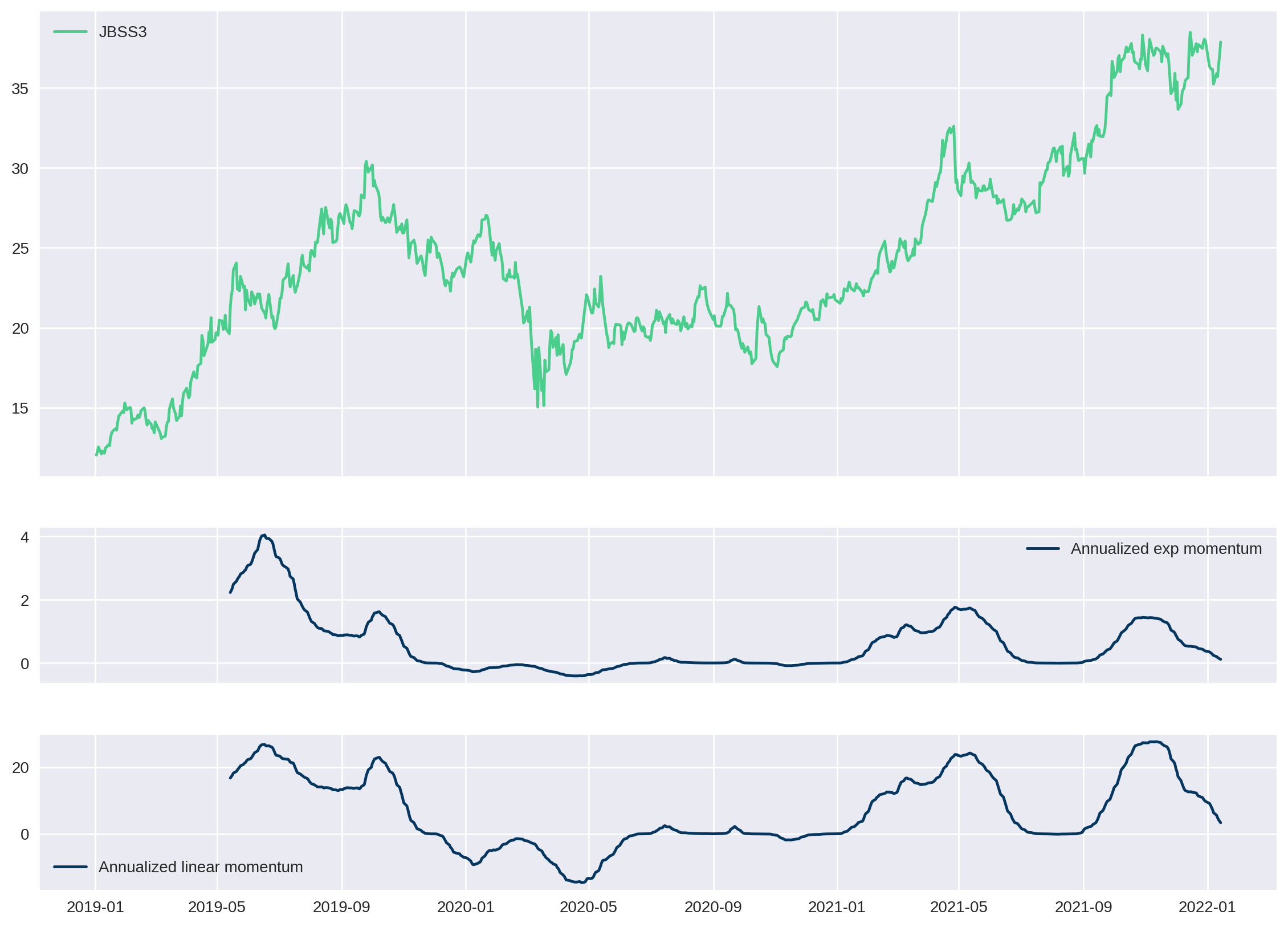 ax3.plot(df.index, df[ticker + '_linear'], label='Annualized linear momentum', color="#033660")