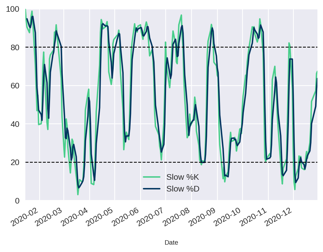 df["Slow %D"] = df["Slow %K"].rolling(mma_window).mean()
