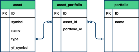 asset, que armazenará as informações relacionadas aos ativos;portfolio, que armazerá quais ativos pertencem a uma determinada carteira.