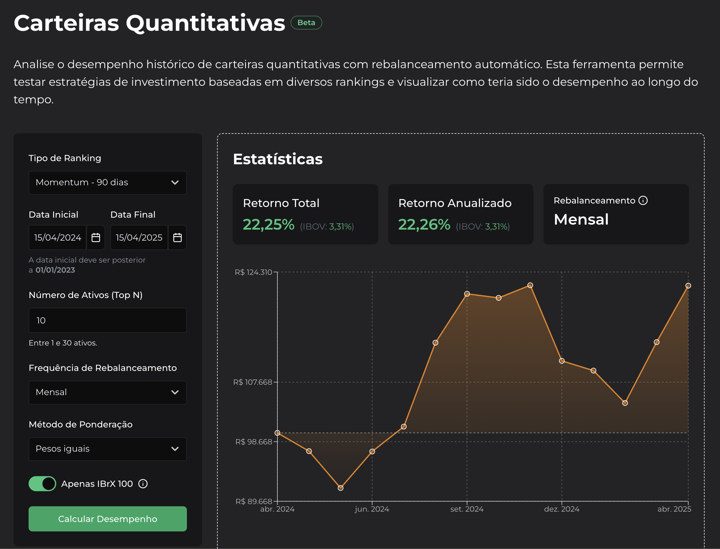 Hoje lançamos uma feature há muito solicitada no QuantBrasil: as Carteiras Quantitativas (beta).