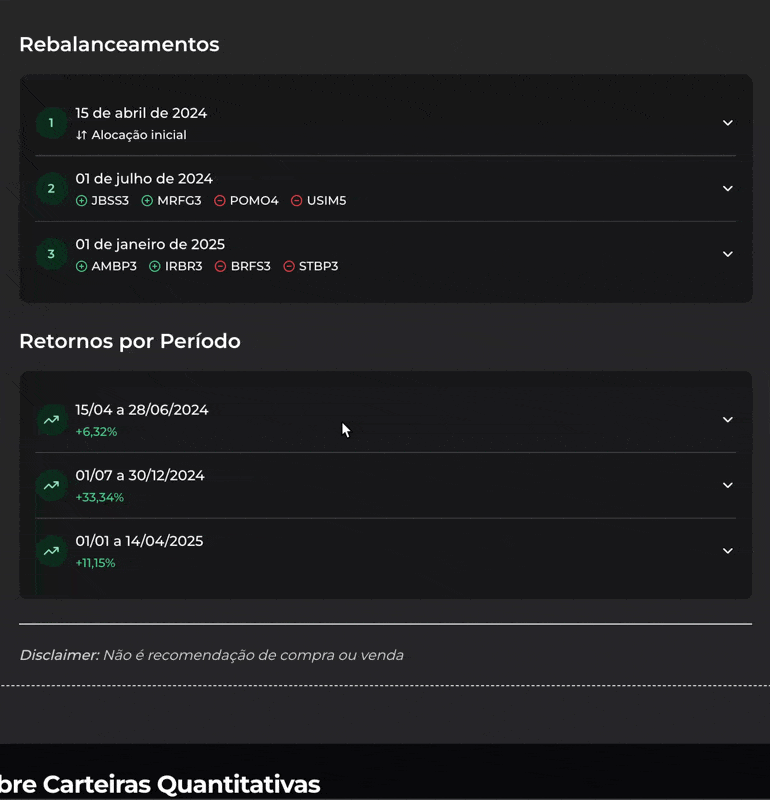 Para cada período de rebalanceamento, é possível verificar quais foram as modificações na carteira e o retorno individual de cada ativo.